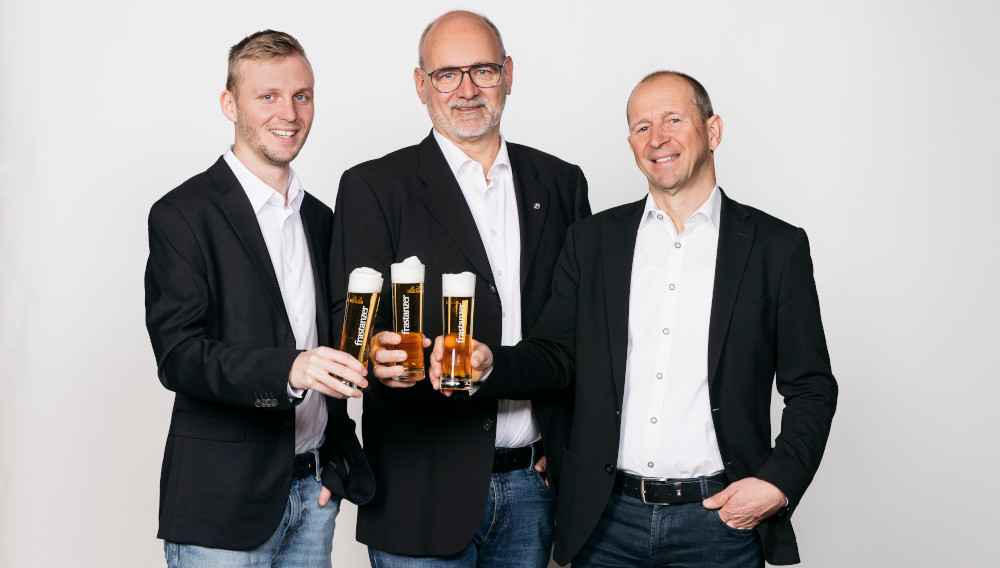 Laurin Bernhart, Martin Koch und Kurt Michelini (v.li.) stoßen auf die Zukunft der Brauerei an
