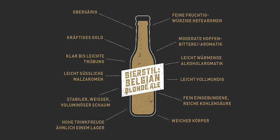 Das Belgian Blonde Ale ist eine sehr süffige, mildere Version des mächtigeren Belgian Golden Ale und wird ähnlich gebraut. Die Malzschüttung ist oft nur eine Mischung aus Pilsner und Wiener Malz mit ein wenig Karamellmalz, wozu drei Saazer Hopfengaben ein gutes Gegengewicht bilden. Dieses Bier ist angenehm trocken und vollmundig im Abgang.