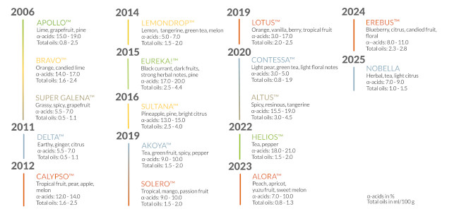 Hopsteiner has been a pioneer in hop breeding for decades and has introduced a broad range of hop varieties, each developed with a clearly defined brewing purpose (fig. 1). This long-term breeding strategy reflects the company’s focus on combining brewing relevance with agronomic reliability.