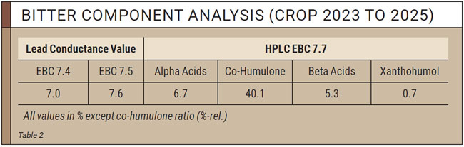 The averaged lead conductance value, acc. to EBC Analytica 7.5, to determine the hop’s bitter content is 7.6 % (table 2).